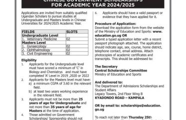 Applications are invited from suitably qualified Ugandan Scholars to pursue studies at Undergraduate and Masters levels in Chinese Universities for 2024/2025 Academic Year