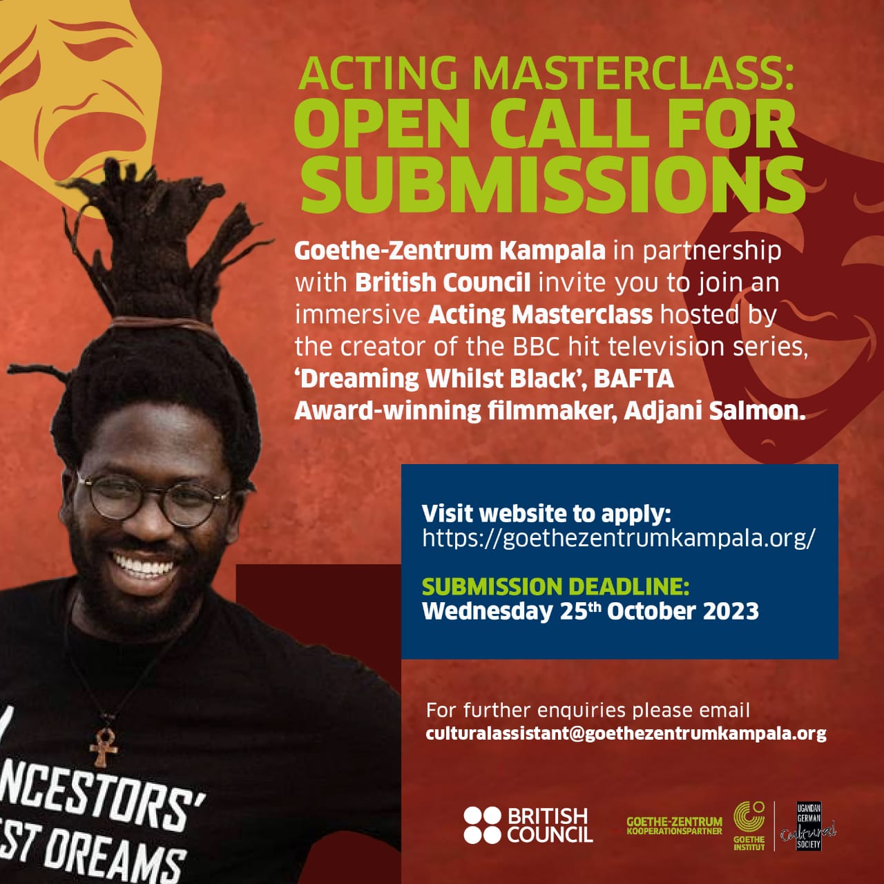 Are you passionate about acting? Do you wish to refine your technique and take your performance to new heights? Goethe-Zentrum Kampala in partnership with British Council invite you to join an immersive Acting Masterclass hosted by the creator of the BBC hit television series, ‘Dreaming Whilst Black’, BAFTA Award-winning filmmaker, Adjani Salmon.